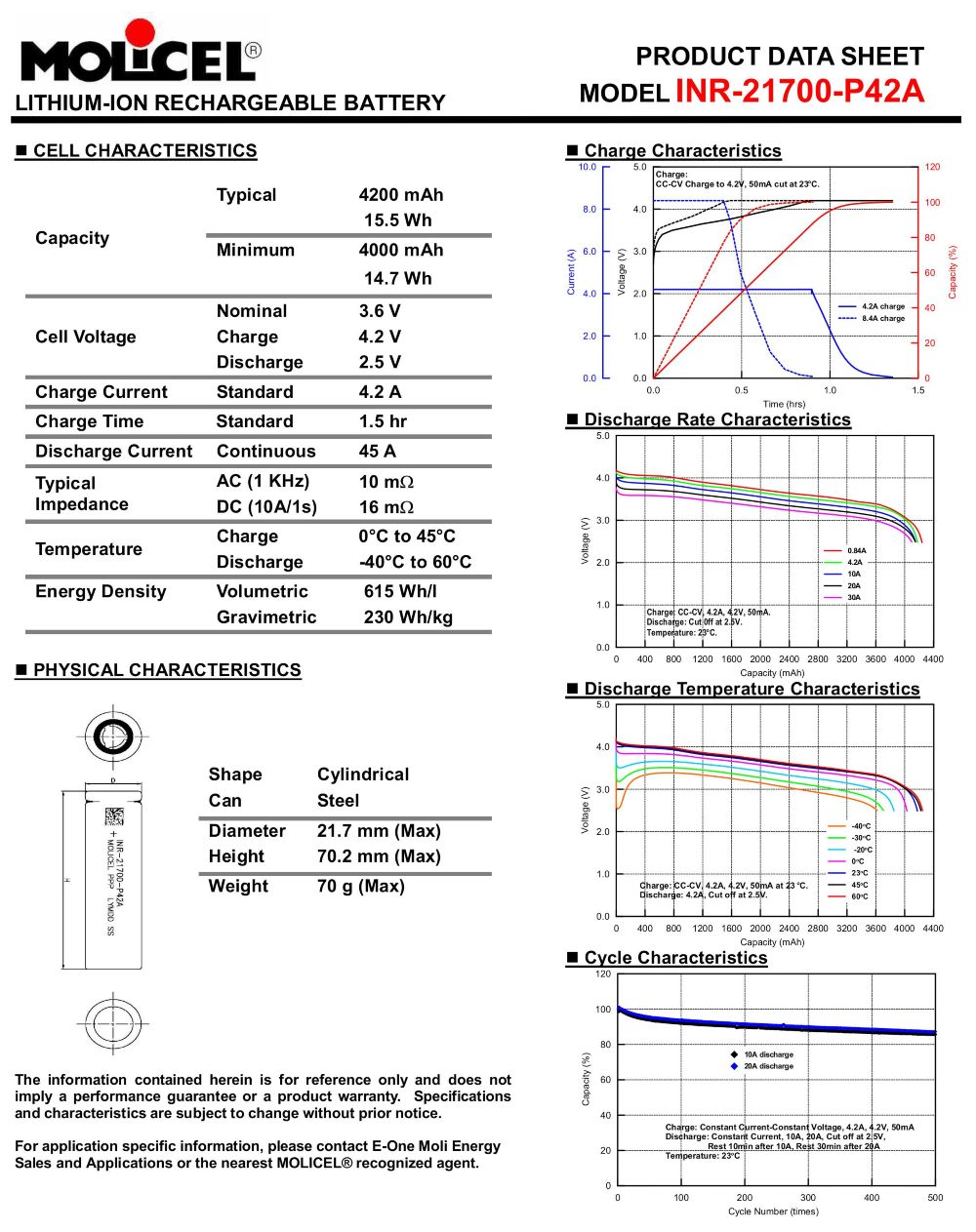 Molicel 21700 P42A 4200mAh 45A Li-Ion Battery