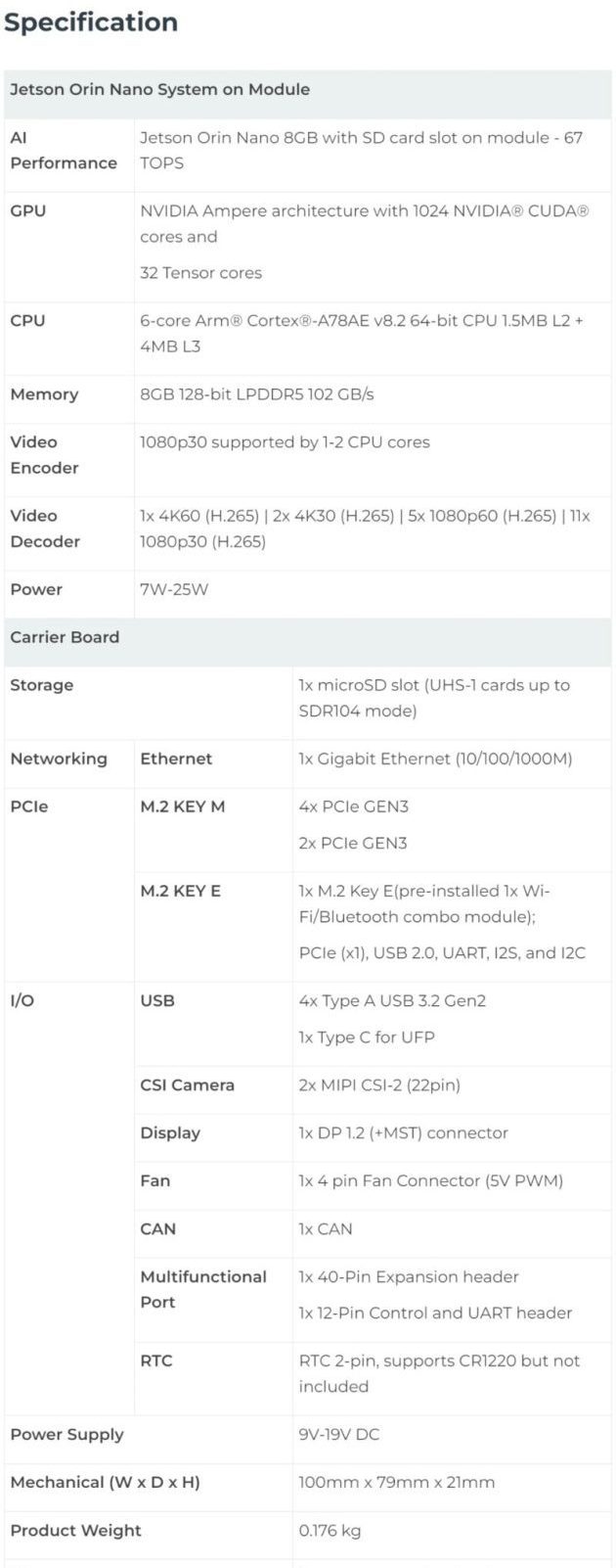 GPU: NVIDIA Ampere, 1024 core, 32 Tensor Cores