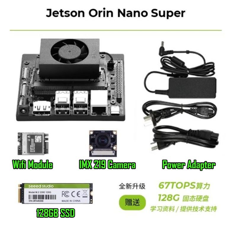 Pack Includes: Orin Nano Super 8G + Base Board + Power Adapter + Wifi Card + 128G SSD + IMX219 Camera